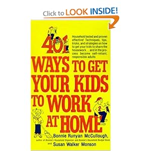I recently complained to a friend of mine that I felt like I needed to teach my children to do more work around the house. She was so sweet as to give me her copy of 401 Ways to Get Your Kids to Work at Home by Bonnie Runyan McCullough and Susan Walker Monsoon. I read it as soon as I got it, but have yet to set up a "chore chart." I will do so soon!